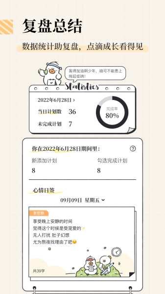 在这里胖咕噜和天鹅姐姐会帮助你完成每天的计划安排和事项记录,记录你的生活和成长。是将生活井井有条的助手,也是你记录生活的笔记本。